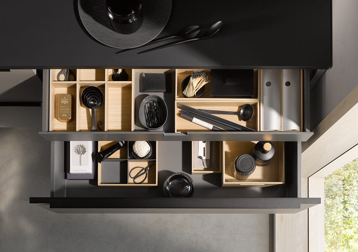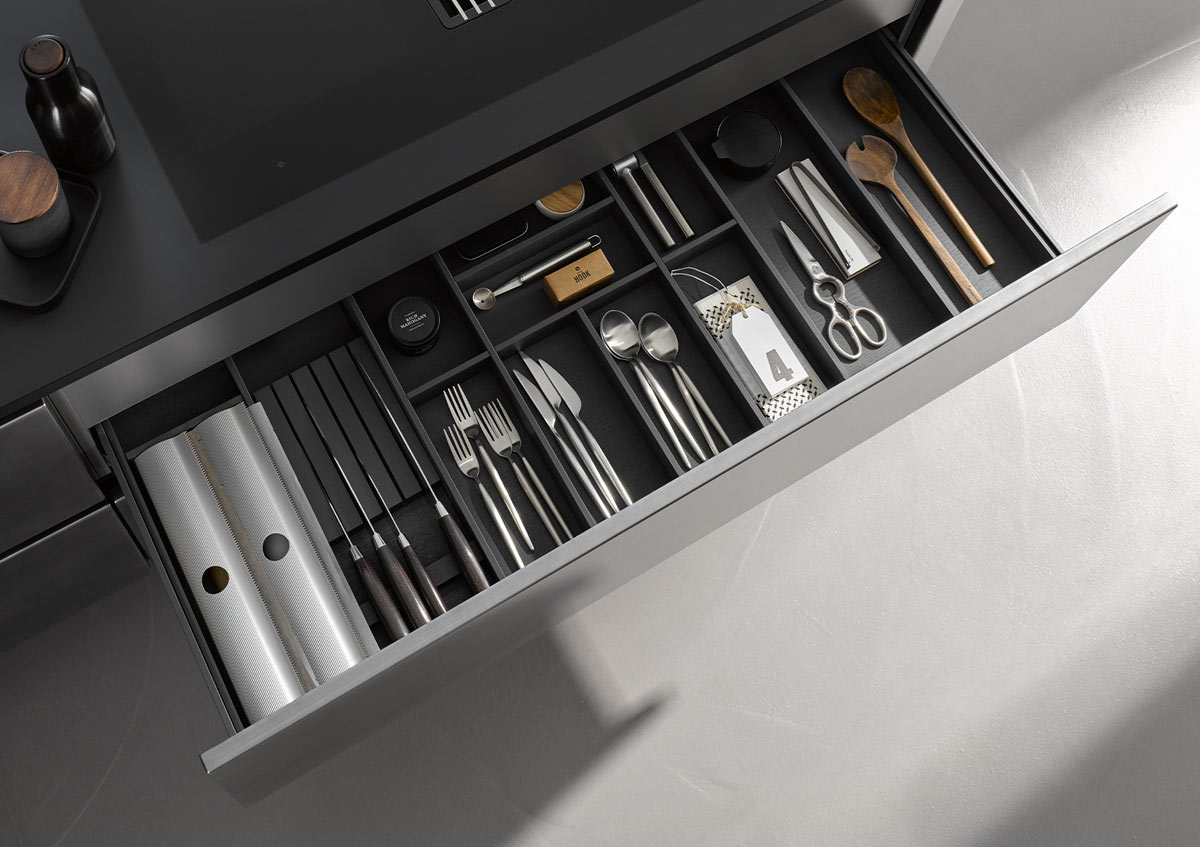 Nasze akcesoria kuchenne optymalne wykorzystanie dostępnej przestrzeni do przechowywania. Dzięki wkładom na sztućce wykonanym z drewna i forniru dębowego można przechowywać noże, łyżki i inne przedmioty nie tylko stylowo, ale także praktycznie. Wkład na sztućce można uzupełnić o dozowniki folii i wkłady na noże. Wkłady z ruchomymi przegrodami umożliwiają zmianę struktury szuflad w zależności od potrzeb. Tak właśnie działa dynamiczne projektowanie kuchni - tak zmienne jak Twoje życie. Nigdy więcej szukania z talentem organizatorskim Häcker!